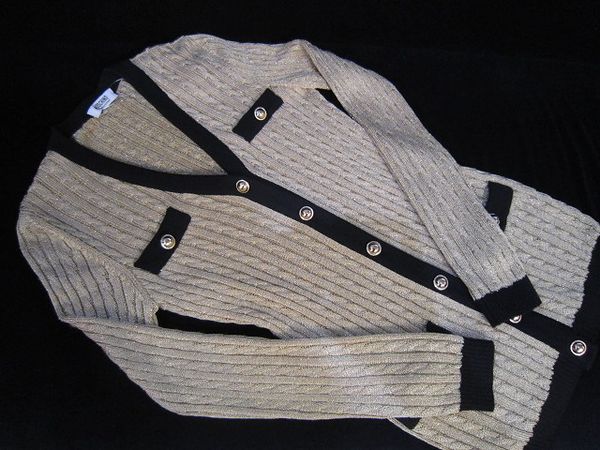金ボタンがゴージャスなゴールドと黒のロングカーディガンです。