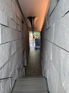 コンクリート打ちっぱなしのビルからは緑の木々が生い茂っています。